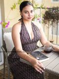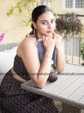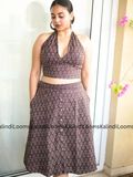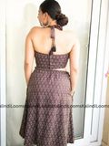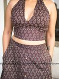 The statement top features a dramatic plunging neckline that creates a stunning focal point, balancing feminine allure with artistic tradition. Meticulously crafted by skilled artisans, each piece displays intricate block prints applied using carved wooden blocks—a centuries-old technique that results in subtle variations making your set truly one-of-a-kind. The earthy coffee brown base is complemented by delicate geometric patterns in contrasting natural white, creating a sophisticated visual rhythm that honors India's textile legacy.